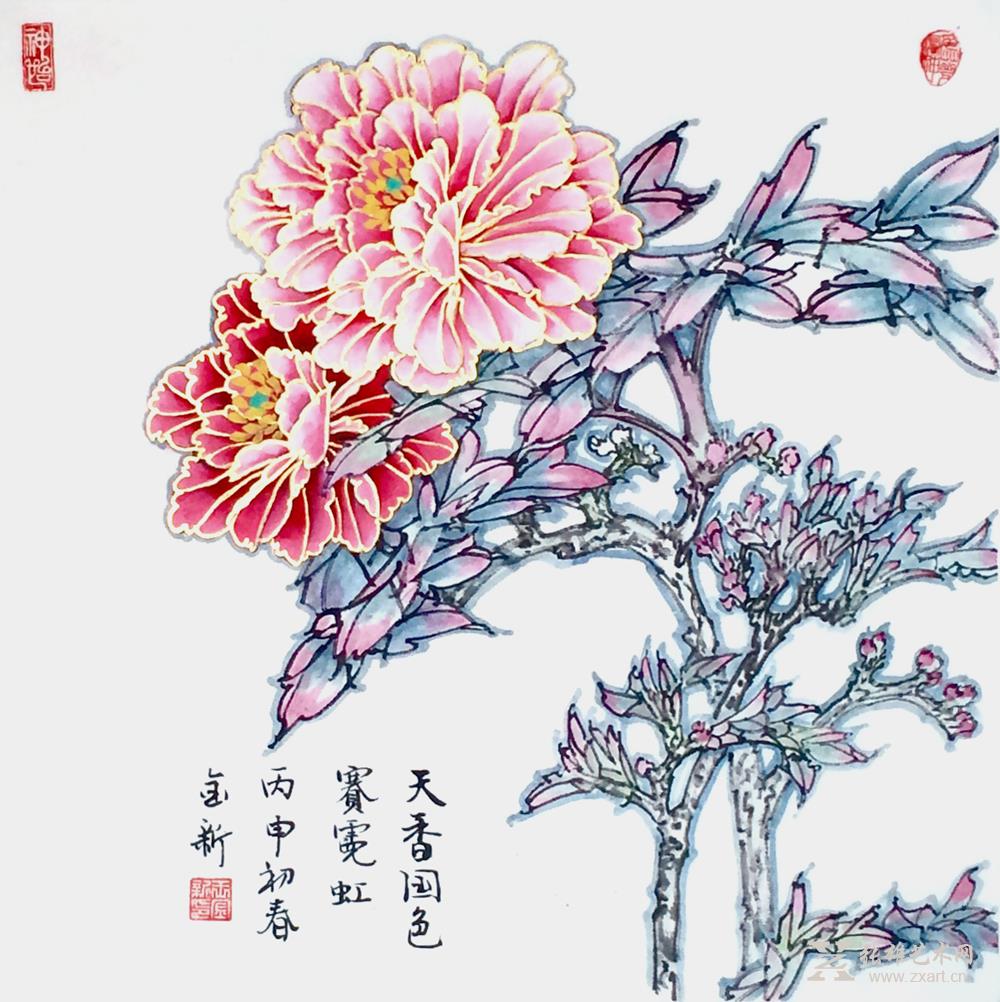 王金新国画作品-《天香国色赛霓虹》