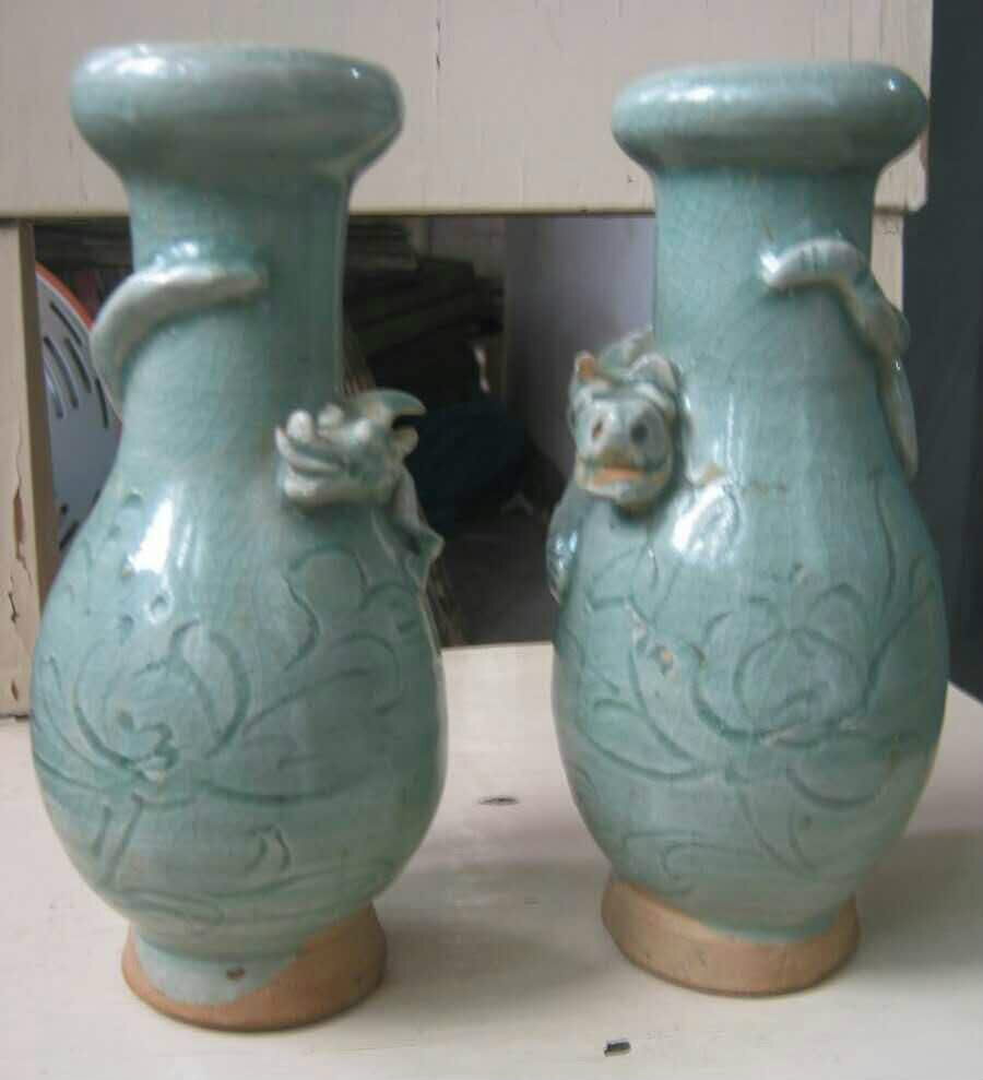 宋龙泉窑龙虎盘口瓶一对